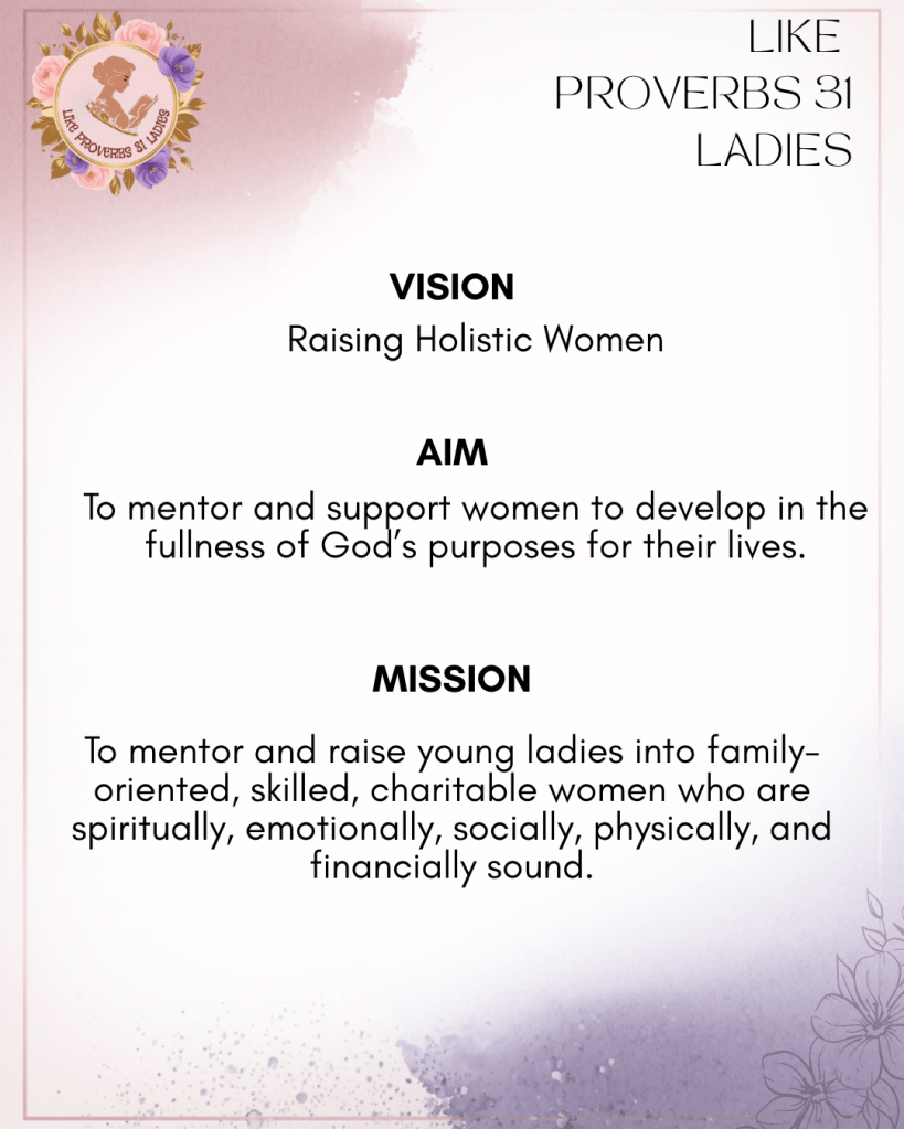 We are here to mentor and raise young ladies into Skilled and Charitable Women that are sound Spiritually, Family-wise, Mentally, Socially, Physically and Financially.